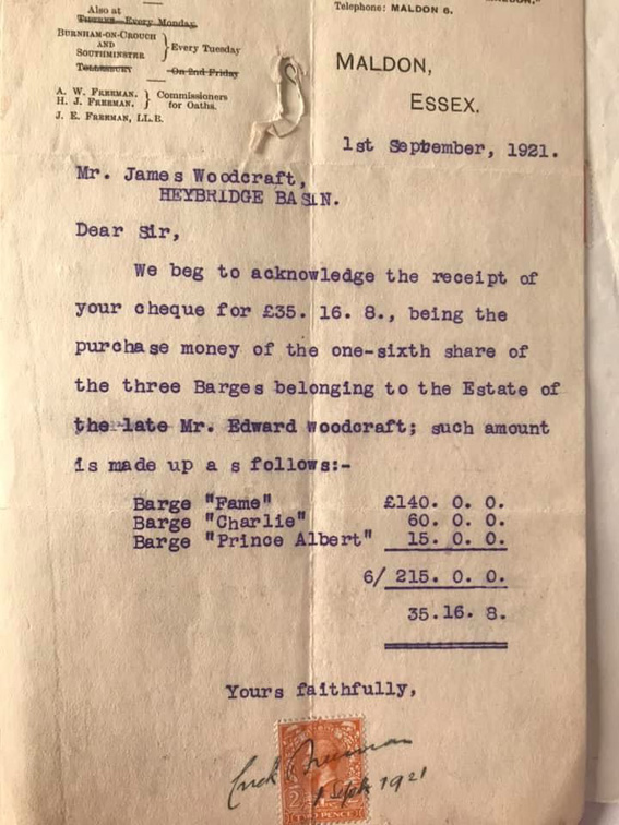 James Woodcraft of three canal barges 'Fame', 'Charlie', and