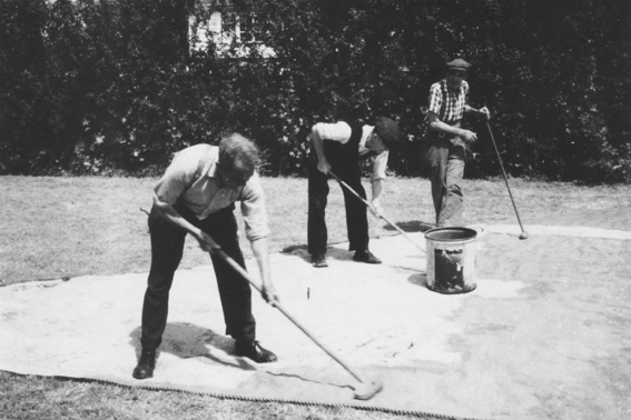 (middle) and two mates are scrubbing a barge sail on the green