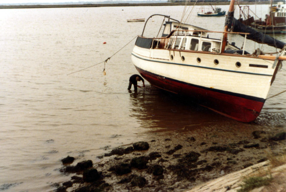 Clark cleaning the bottom of Peter Tolfrey's boat on the beach